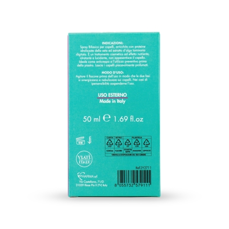 - Spray Bifasico capelli anti-crespo e termoprotettore a base di Proteine idrolizzate della seta ed Estratto di alghe marine. L’azione sinergica delle due fasi (acquosa ed oleosa) genera una texture leggera che avvolge i capelli in un film protettivo e setoso.